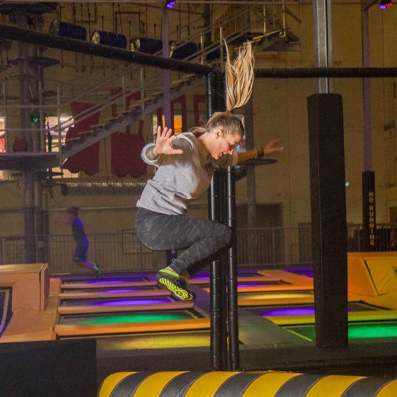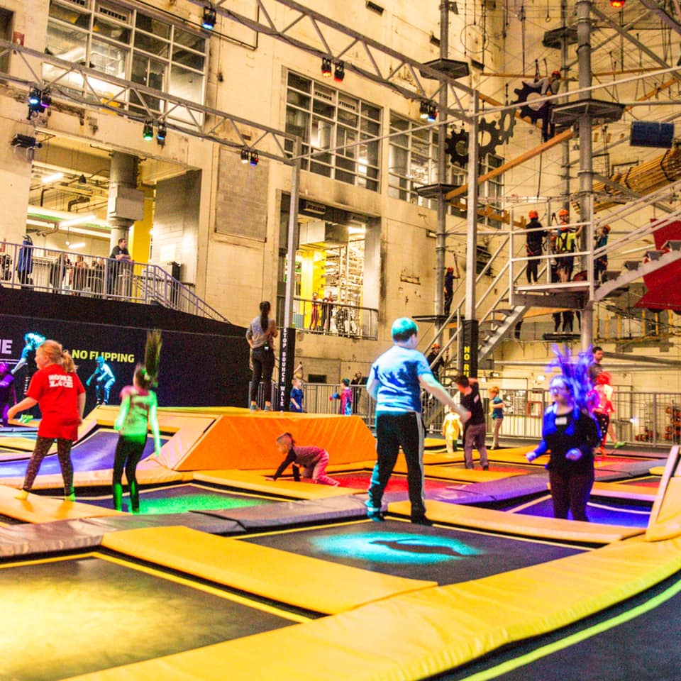 • Trampoline Park: Área con camas elásticas conectadas y canastas de baloncesto aéreo.